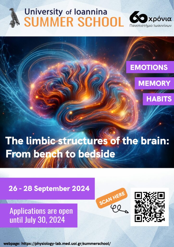 Το Εργαστήριο Φυσιολογίας της Ιατρικής σχολής του Πανεπιστημίου Ιωαννίνων διοργανώνει θερινό σχολείο με θέμα «The Limbic Structures Of The Brain: From Bench To Bedside», στις 26-28 Σεπτεμβρίου στα Ιωάννινα. Στόχος του είναι να παρέχει όλες τις απαραίτητες γνώσεις και δεξιότητες για τη μεταφραστική έρευνα στο μεταιχμιακό σύστημα.